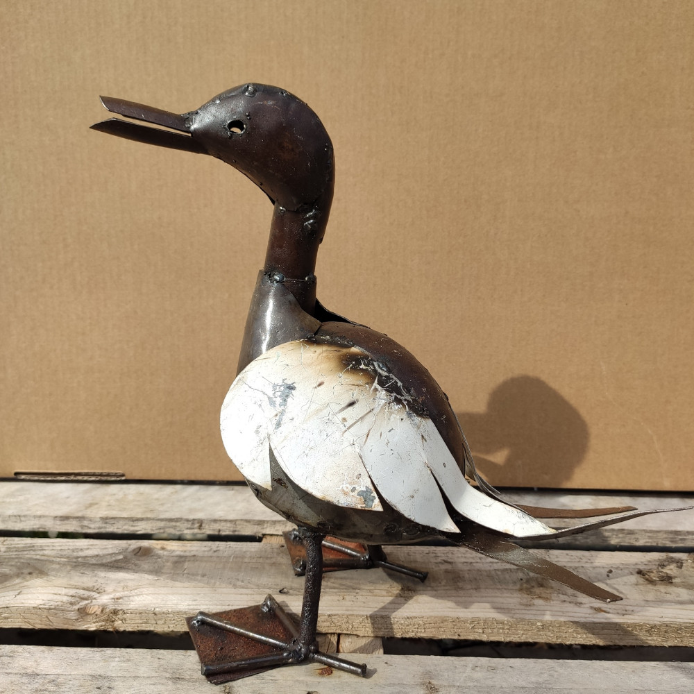 Grand canard mesurant environ 40 cm de haut, Fabriqué à partir d'acier doux recyclé, ces sculptures métalliques peuvent être laissées à l'extérieur toute l'année, elles peuvent être recouvertes d'une laque transparente ou d'un vernis extérieur transparent environ une fois par an ou selon les besoins. Elles peuvent être fixées au sol à l'aide d'un piquet de tente. Les photos ne sont données qu'à titre d'illustration car chaque sculpture sera légèrement différente en taille et en apparence.